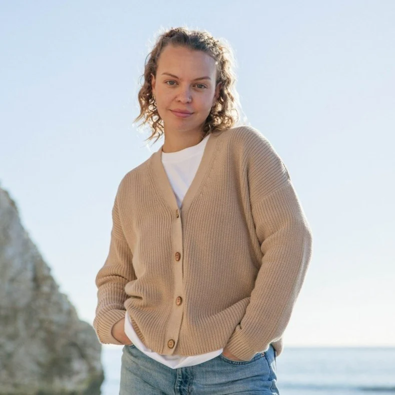Rapanui‘s mission to ensure fair treatment for people, the planet, and animals is realised through a steadfast commitment to GOTS-certified organic cotton and the recycling of old synthetic clothing into new fibres for items where cotton cannot be used. This cardigan’s colour is as close to Mocha Mousse as it gets.