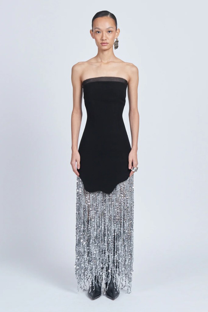 black crafted fringe cascade dress